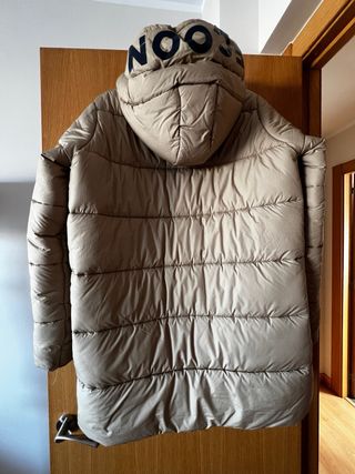 Abrigo largo acolchado con capucha ajustable. Talla 36 muy amplia, yo uso talla 38 y queda amplio. Material: poliéster reciclado. Como nuevo, muy poco uso. - Cierre de cremallera. Se abre por arriba y por abajo. - Bolsillos frontales con cremallera. - Abertura lateral con cremallera. - Logo en la manga y en el pecho. Precio no negociable. Se hacen envíos. Portes no incluidos.