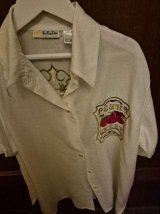 Blusa de verano con un diseño bordado en la parte delantera y detrás. Aberturas laterales en el bajo.100% viscosa. - Estampado de cerezas y la palabra SWEET. - Cuello camisero. - Manga corta.