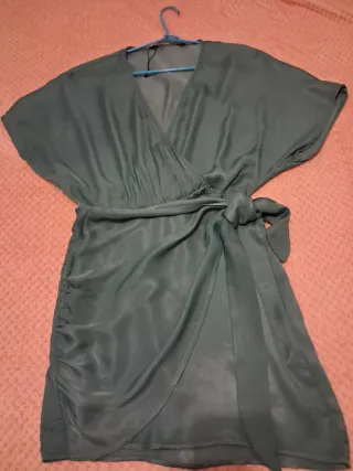 Bonito vestido de Zara con un elegante diseño cruzado y cinturón. - Manga corta tipo murciélago. - Detalle fruncido en un lateral. - Falda con abertura. - Tejido satinado.