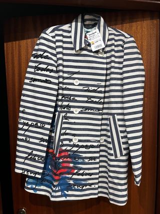 Abrigo tipo gabardina de la marca Desigual con un diseño original. - Estampado de rayas marineras. - Detalle de escritura y estampado floral en la parte delantera. - Cierre cruzado con botones.