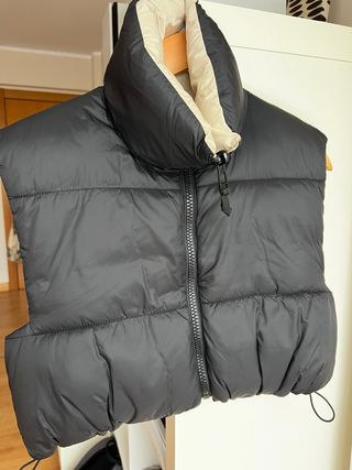 Chaleco acolchado reversible con cuello alto. Talla S/M Tallaje europeo t.S/M (38/40) Como nuevo, muy poco uso. - Diseño moderno y versátil. - Cierre de cremallera frontal. - Cordón ajustable en el bajo. Precio no negociable. Se hacen envíos. Portes no incluidos.