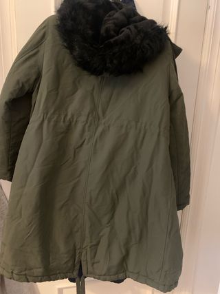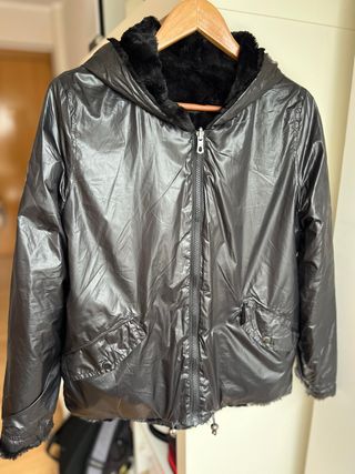 Cazadora con capucha y forro interior de pelo sintético. Tallaje europeo t.S (38) Como nueva, muy poco uso. - Diseño reversible. - Cierre de cremallera. - Bolsillos frontales con botón. - Bajo ajustable. Precio no negociable. Se hacen envíos. Portes no incluidos.