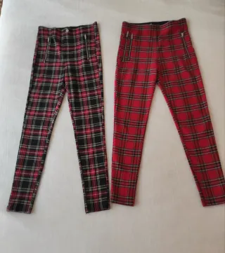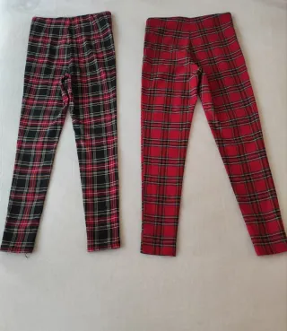 Leggings con estampado de cuadros, cintura elástica interior. Tiro alto. Dos puestas. Prácticamente nuevos. 8€ cada uno.