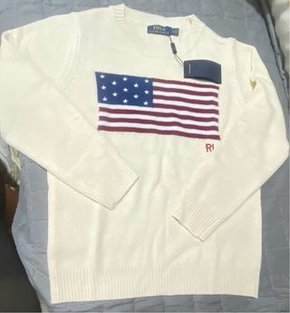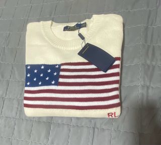 Jersey de Polo Ralph Lauren con diseño de la bandera de Estados Unidos. Es una prenda de punto con un estilo clásico y llamativo. - Diseño de la bandera americana. - Cuello redondo. - Puños y bajo acanalados. - Logo RL bordado en la parte inferior derecha.