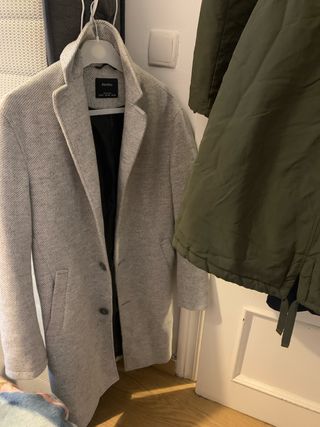 Abrigo de la marca Bershka. - Color gris con detalles en verde militar. - Diseño clásico con cuello. - Cierre de botones.