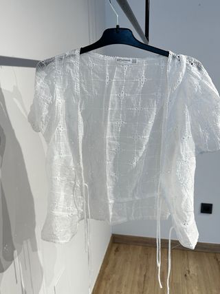 Conjunto de dos camisetas de encaje blanco, una de manga larga y otra sin mangas. - Diseño delicado de encaje floral. - Detalle de pliegues en la parte delantera. - Cintura ajustable con cordón. - Acabado con volantes en el bajo.