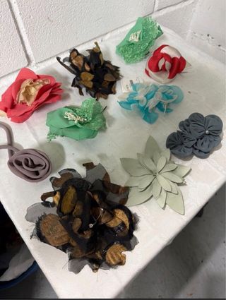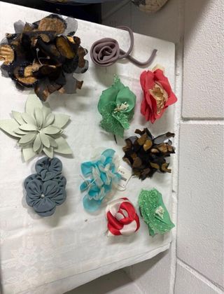 Conjunto de adornos florales hechos de tela, ideales para personalizar ropa o para usar como accesorios para el cabello. - Diseños variados en forma de flor. - Materiales textiles de diferentes texturas y acabados.