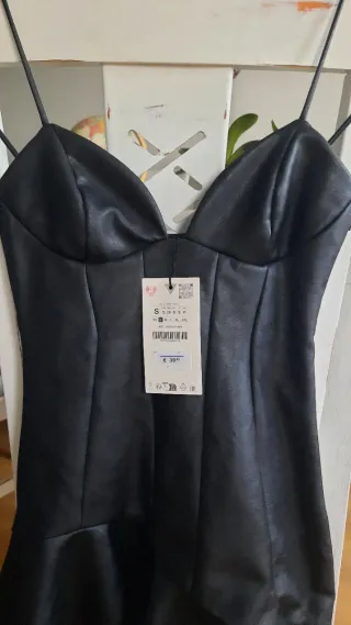 Elegante vestido de polipiel con un diseño moderno. - Corte sin mangas. - Largo hasta el tobillo. - Cremallera trasera para cierre.