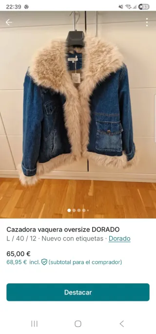 Cazadora vaquera oversize de la marca DORADO. Es una prenda nueva con etiquetas. - Diseño oversize. - Acabado vaquero. - Detalle de pelo en cuello y puños.