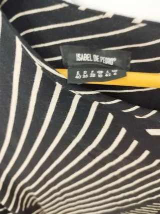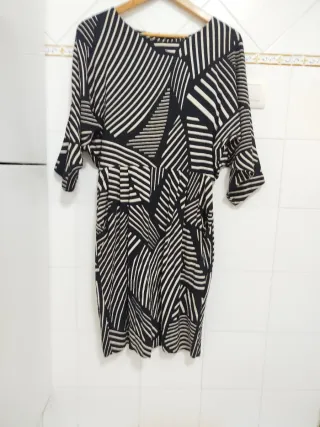 Vestido con un llamativo estampado. - Diseño de rayas blancas sobre fondo negro. - Corte moderno y favorecedor.