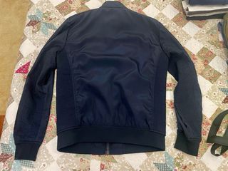 Chaqueta estilo bomber en color azul marino. - Cierre de cremallera frontal. - Bolsillos laterales con cremallera. - Cuello redondo. - Puños y bajo elásticos.