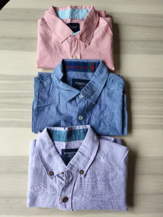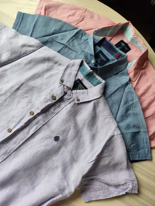Lote de tres camisas de verano, manga corta, de la marca Springfield. Perfectas para un look casual. - Camisa de color lila. - Camisa de color azul denim. - Camisa de color rosa pálido.