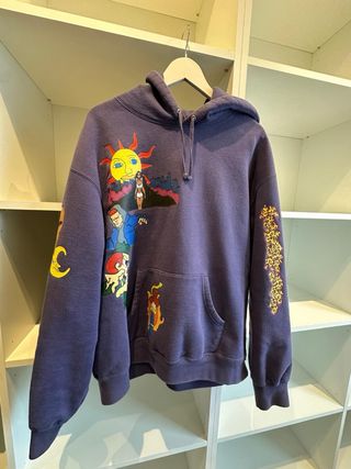 Sudadera Supreme con un diseño gráfico llamativo en la parte delantera y mangas. - Ilustración de sol, luna y figuras. - Bolsillo frontal tipo canguro. - Capucha con cordones.