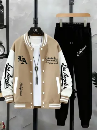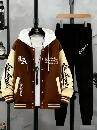 Conjunto deportivo de dos piezas con diseño inspirado en LA y California. - Chaqueta estilo béisbol con capucha. - Pantalón de chándal a juego. - Detalles bordados y estampados.