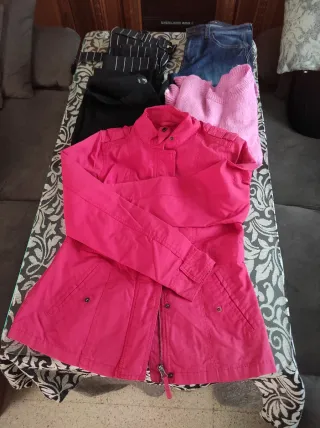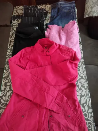 Conjunto de prendas de vestir en talla M. Incluye una chaqueta, un jersey y un pantalón. - Chaqueta de color rojo intenso. - Jersey de lana color rosa. - Pantalón negro con rayas blancas. - Pantalón vaquero azul. _ pantalon negro chino. Merece la pena está todo en condiciones