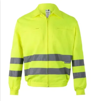 Cazadora de trabajo de alta visibilidad, modelo Cazadora CANDEUX-V, Fabricada por la empresa española Iturri. Está diseñada como prenda de seguridad laboral, utilizando material reflectante 3M Scotchlite para mejorar la visibilidad del usuario en condiciones de poca luz o entornos de alto riesgo.