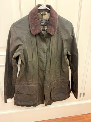 Chaqueta estilo clásico Barbour Beadnell en color verde. Un diseño atemporal y versátil. - Cuello de pana. - Cierre de botones a presión. - Bolsillos frontales con solapa. En buen estado, sin desgarros, cuello de pana bien conservado. Tiene pequeñas manchas sobretodo en puños y bolsillos que se aprecia poco (véase últimas fotos) Limpieza y engrasado reciente. Medidas: largo de manga desde la axila 44cm, ancho de axilas 45cm, cintura 43cm, largo desde la base del cuello 66cm