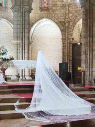 Elegante vestido de fiesta para mujer con un llamativo estampado en lentejuelas. - Diseño con escote en V y de corte imperio. - Tirantes finos, no se necesita sujetador. - Largo hasta el suelo, con una pequeña cola por detrás. Para chicas de talla 36/38 y que midan alrededor de 1,60 cm. - Puesto una vez. Incluye tocado y chaqueta torera. Precio original 400€