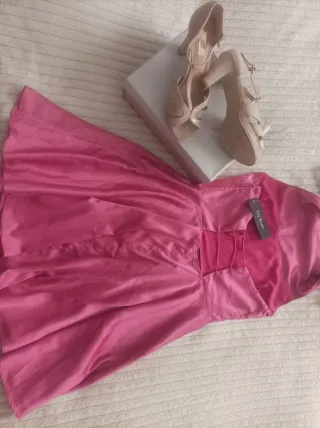 Conjunto de ropa para mujer, talla S, que incluye un vestido y un par de zapatos. - Vestido rosa con cuello halter. - Zapatos color nude con tiras.