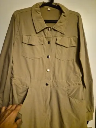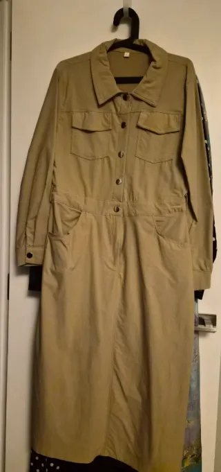 Vestido de manga larga con cuello camisero y botones frontales. Diseño elegante y versátil. - Dos bolsillos en el pecho. - Cintura marcada. - Bolsillos laterales en la falda.