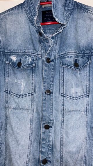 Chaqueta vaquera con un diseño moderno y juvenil. - Cuerpo de denim azul. - Mangas de tela gris. - Cierre de botones. - Bolsillos en el pecho. -Envío rápido y seguro📦 -Preguntar sin compromiso✅ -Precio negociable💰