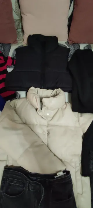 Conjunto de ropa ,abrigo sin usar gris blusa blanca stradivarius, pantalón vaquero azul oscuro