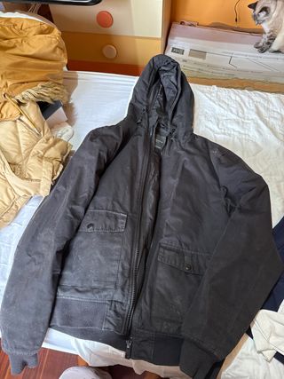 Abrigo negro de la marca Pull&Bear. Talla grande, es bastante cálido y cubre parte alta de muslo, con capucha y forro.