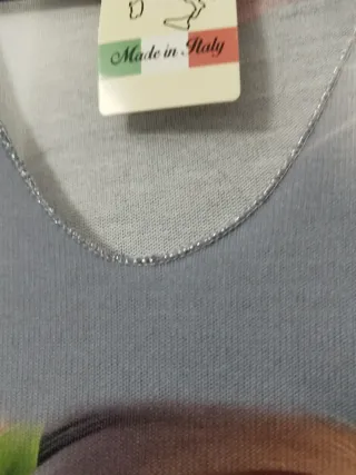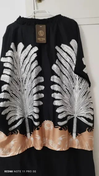 Prenda de vestir con un diseño llamativo de hojas en contraste. - Estampado de hojas en blanco sobre fondo negro. - Detalle de borde inferior en color beige con motivos. - Diseño de manga corta. Nuevo a estrenar talla desde la 42 a la 50 falda con goma elástica