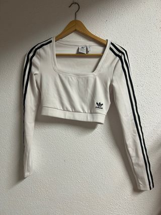 Top deportivo Adidas de manga larga. - Diseño cropped. - Cuello cuadrado. - Rayas icónicas en las mangas. - Logo de Adidas en el pecho.