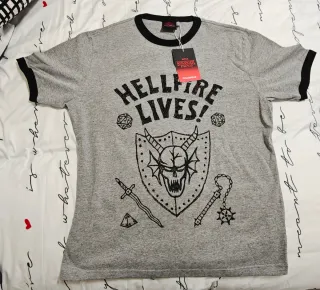Camiseta gris de Pull&Bear inspirada en Stranger Things. - Diseño con el lema Hellfire Lives!. - Estampado frontal con escudo, calavera, espadas y dados. - Cuello y mangas con ribete negro.