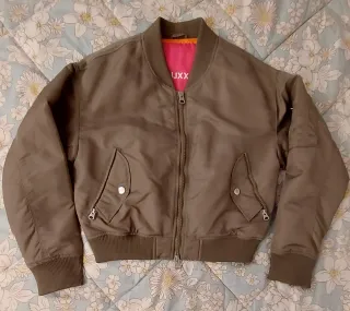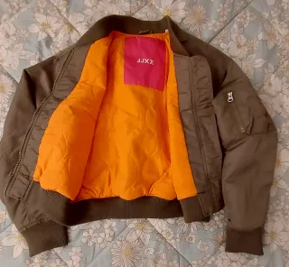Chaqueta estilo bomber en color verde oliva. Presenta un forro interior de color rosa y naranja vibrante y un diseño clásico. - Cierre frontal con doble cremallera. - Bolsillos laterales con cremallera y botón a presión. -Bolsillo en el brazo. - Puños y cintura elásticos.