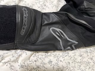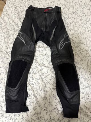 Pantalones de cuero para moto de la marca Alpinestars. Parte inferior mono. Cremallera para unir a la chaqueta. Talla 52 (talla diferente Alpinestars, revisar su tallaje) equivale a 42-44 creo. Prácticamente nuevos. Viene con sus protecciones completas. Sin deslizadera. - Diseño en color negro. - Paneles de cuero. - Detalle de logo Alpinestars.