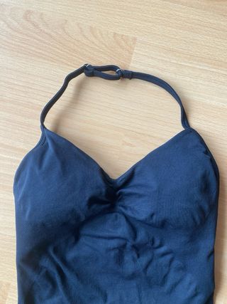 Top de deporte de color negro con sujetador incorporado y relleno, hace efecto push-up. Estilo top DFYNE con cuello halter y tira ajustable. Es talla S pero talla muy ajustado, también podria servir para una XS.