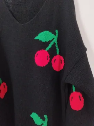 Jersey de punto negro con un divertido estampado de cerezas rojas y hojas verdes. Su corte oversize lo hace muy cómodo y moderno. - Diseño de cerezas. - Cuello en V. - Manga larga.