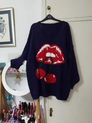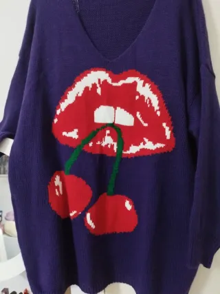 Jersey de punto oversize con un llamativo diseño. - Estampado frontal de labios rojos y cerezas. - Cuello en V. - Manga larga.