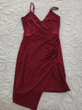 Vestido elegante de color burdeos con un diseño drapeado, ideal para eventos (comunión , bautizo) Tela muy gustosa - Tirantes finos ajustables. - Escote en V cruzado. - Detalle fruncido en el lateral. - Abertura lateral. - Bajo asimétrico.