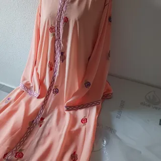 Preciosa takchita vintage con bordados florales. - Talla L/XL. - Diseño con bordados en tonos rosas y morados. - Manga larga. - Cierre frontal con detalles. - Largo hasta los tobillos.