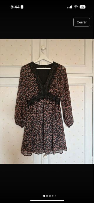 Vestido negro de la marca Etam con un diseño asimétrico. - Tejido con estampado floral con pequeños toques brillantes. - Volante en el escote. - Corte a la cintura. - Precio negociable.