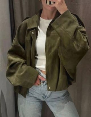 Chaqueta bomber de Zara en talla M de cuello solapa y manga larga con trabilla en hombro. Bajo acabado con pliegues y volumen. Cierre frontal con botones ocultos por sopata. Verde kaki Ref 4344 755 Original de Zara🏷️ Envíos rápidos ✈️📦 Se graban los envíos por seguridad🚨