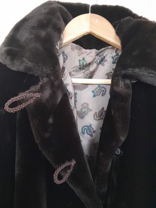 Abrigo confeccionado a medida. Aprox talla 40 (medidas en las fotos). Mouton sintético de primera calidad. Color marrón oscuro, casi negro. Mangas ranglan. Tiene dos bolsillos. Como nuevo