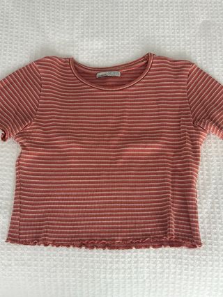 Top de manga corta con un diseño de rayas finas. El bajo tiene un acabado festoneado. Talla bastante mas pequeña!