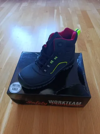 Conjunto de ropa de trabajo de la marca WORKTEAM. - Pantalones de color azul con detalles en amarillo. - sudadera de alta visibilidad en color amarillo. - Polo de trabajo en color amarillo con detalles en azul marino. - Calzado de seguridad, talla 39