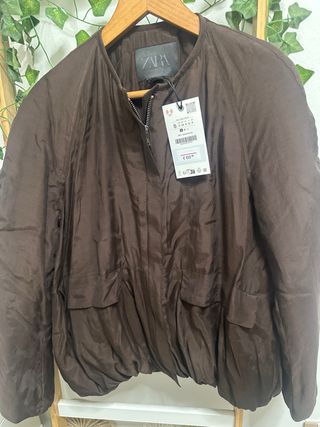 Chaqueta acolchada de Zara con un diseño moderno y elegante. - Color marrón. - Talla S amplia - Cierre de cremallera. - Bolsillos frontales.
