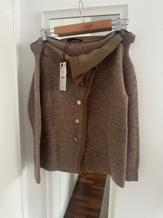 Chaqueta de punto con un diseño moderno y cómodo. - Tejido en color crema. - Cierre con dos botones oscuros y dos cuerdas. - Bolsillos delanteros. - Capucha integrada. Era una talla S pero se ha encogido mucho.