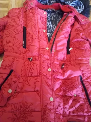 Abrigo con un diseño llamativo y moderno. - Estampado floral en tonos rojos y negros. - Capucha con pelo sintético. - Cierre de cremallera y botones. - Bolsillos frontales con cremallera. - Cremalleros a los lados en la parte de abajo que permite ajustar mejor a la cedera