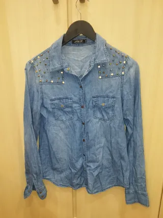 Camisa vaquera de manga larga con un diseño moderno y detalles de tachuelas. - Tachuelas doradas y plateadas en hombros y bolsillos. - Cierre de botones. - Dos bolsillos en el pecho con solapa y botón. - Puños abotonados.