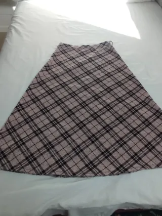 Falda larga con estampado de cuadros, cintura elástica y con un corte acampanado que le da movimiento. - Diseño de cuadros en beige/rosado y negro. - Tejido muy agradable y con bonita caída caída. Al tener la cintura elástica la talla puede oscilar entre la 42/44.v