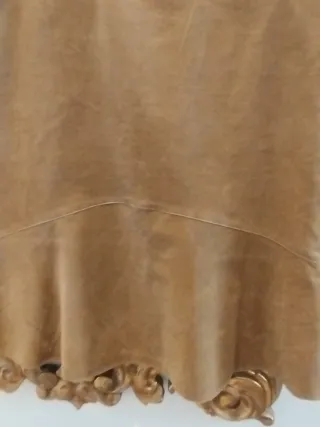 Falda de pana ligeramente acampanada, con presillas para cinturón y con un corte muy original. Tiene un movimiento muy bonito. Medidas cintura 45, largo 69.