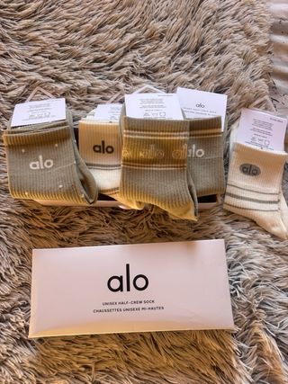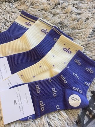 Calcetines de Alo Yoga, ideales para yoga o uso diario. Son cómodos y de alta calidad. Tallan desde un 36 hasta 40 mas o menos. Sueltos los vendo por 6€. - Diseño de media caña. - Logo de Alo en la parte superior. - Combinación de colores morado y crema.