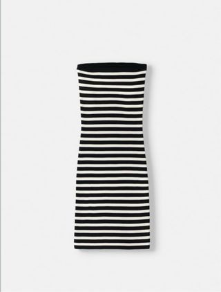 Vestido de rayas blancas y negras, con un diseño ajustado. - Tejido elástico. - Diseño sin tirantes.